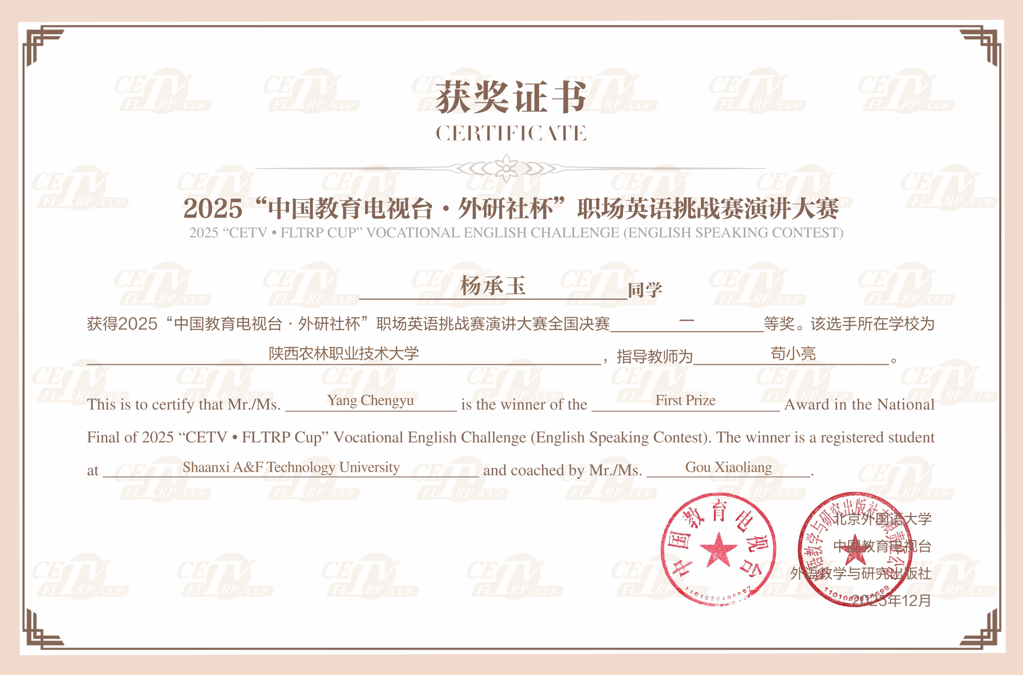 近日,2025“中国教育电视台・外研社杯”职场英语挑战赛写作大赛与演讲大赛全国决赛圆满结束。学校应用英语专业学生杨承玉获演讲赛项全国一等奖,魏晓兰获写作赛项全国二等奖,常璐璐、金思、马海由子、乔雪宁学生团队获英语短视频赛项优秀奖。