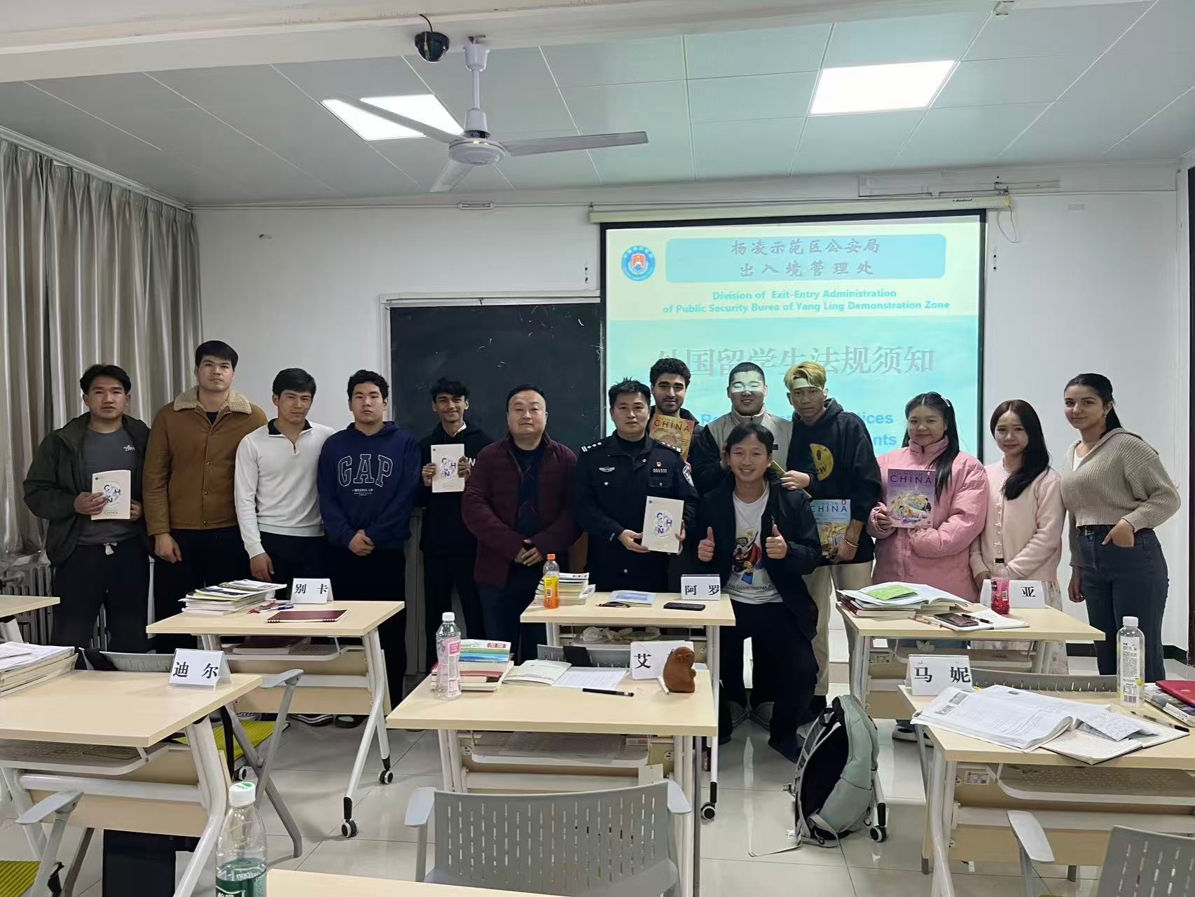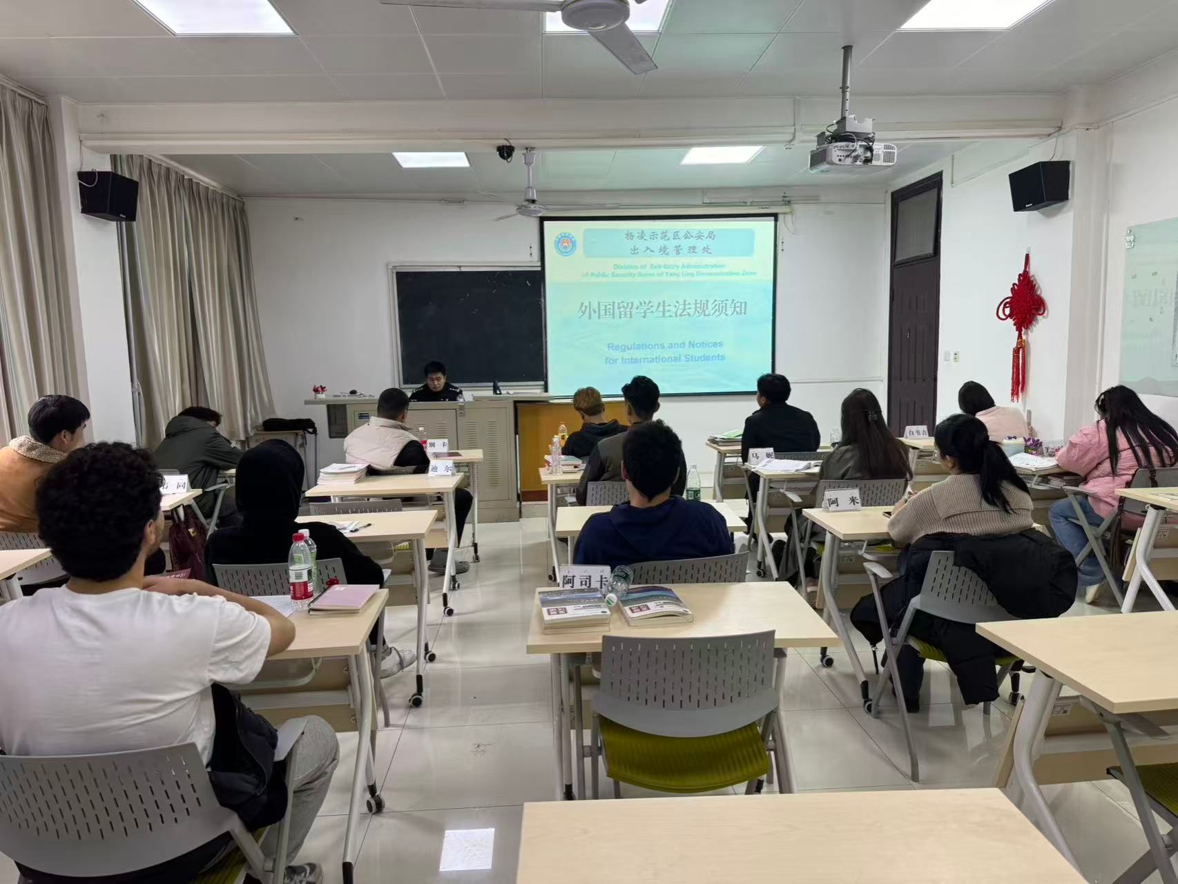 12月23日下午,学校举办国际学生外事法规宣传教育讲座,邀请杨凌示范区公安局出入境管理处警官高川作报告。国际学院教师、2025级国际新生聆听报告。