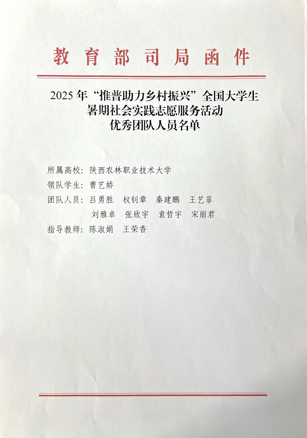 近日,学校药物与化工学院“耕读兴农・青语筑梦”暑期推普社会实践团获评“推普助力乡村振兴”全国大学生社会实践志愿服务活动优秀团队。