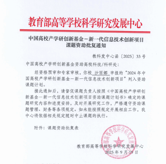 近日,教育部高等学校科学研究发展中心公布了2024年中国高校产学研创新基金——新一代信息技术创新项目立项名单。由信息工程学院教师沙丽娜主持申报的《基于“5G+人工智能”的智慧校园节水灌溉创新研究与应用》项目,成功获批专项一般项目。
