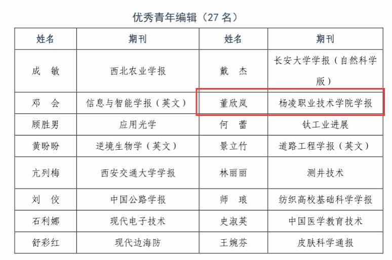 11月10日,第八届陕西省科技期刊建设及编辑培育优秀案例评选结果公示,我校学报编辑部董欣岚老师获“优秀青年编辑”称号。