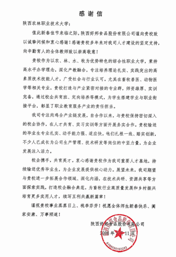 近日,中国水电建设集团十五工程局有限公司、陕西好邦食品股份有限公司、陕西泾航企业管理集团有限公司、陕西标正作物科学有限公司等多家用人单位向学校发来感谢信,对我校毕业生的专业素养、综合能力和敬业精神给予高度评价,并对学校在校企合作、人才共育及就业服务等方面的工作表示感谢。