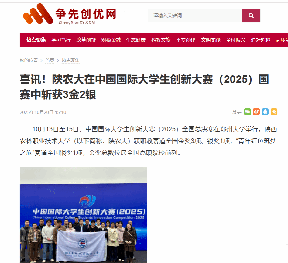 10月13日至15日,中国国际大学生创新大赛(2025)全国总决赛在郑州大学举行。陕西农林职业技术大学(以下简称:陕农大)获职教赛道全国金奖3项、银奖1项,“青年红色筑梦之旅”赛道全国银奖1项,金奖总数位居全国高职院校前列。