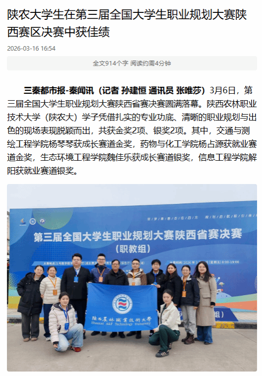 三秦都市报-秦闻讯(记者 孙建恒 通讯员 张唯莎)3月6日,第三届全国大学生职业规划大赛陕西省赛决赛圆满落幕。陕西农林职业技术大学(陕农大)学子凭借扎实的专业功底、清晰的职业规划与出色的现场表现脱颖而出,共获金奖2项、银奖2项。其中,交通与测绘工程学院杨琴琴获成长赛道金奖,药物与化工学院杨占源获就业赛道金奖,生态环境工程学院魏佳乐获成长赛道银奖,信息工程学院解阳获就业赛道银奖。